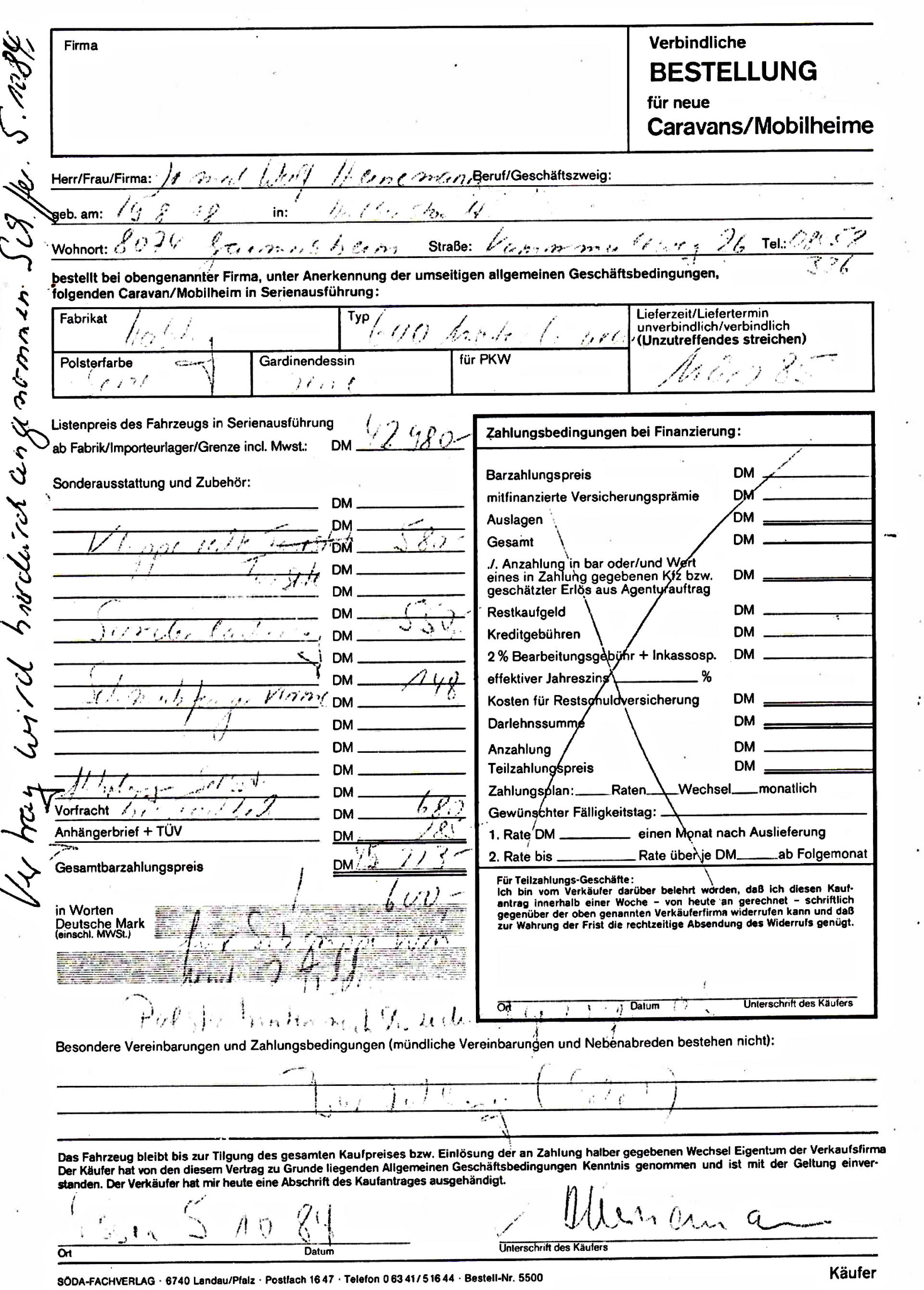 Der auf der Messe vom Hobby Wohnwagenwerk neu vorgestellte Hobby 600 erfüllte nicht nur das Höhenkriterium, sondern überzeugte Dr. H. auch sonst. Am 2. Oktober 1984 unterzeichnete er kurzentschlossen den Kaufvertrag.
