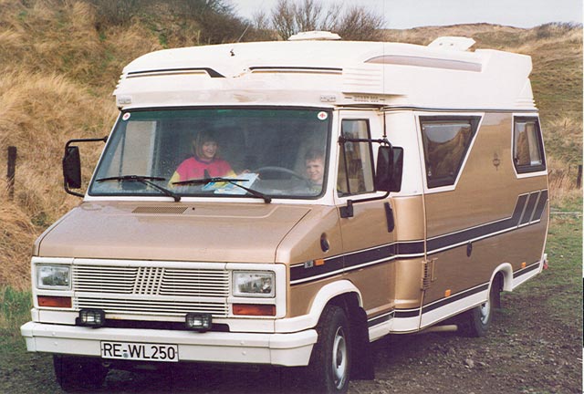 An einem Sonntag Ende September 1990 fuhren wir auf der B1 durch Dortmund. Dabei sahen wir im Vorbeifahren bei einem Wohnmobilhändler einen goldenen Hobby 600 stehen. „Den können wir uns ja mal anschauen. Gucken kostet ja nichts!“ Nur beim gucken haben wir uns dann etwas verguckt. Da stand er nun: goldmetallic, drei Jahre alt, 74.000 km auf der Uhr und 36.000 DM auf dem Preisschild. Dafür hatte er noch einen Motorradträger und eine Top-Box als Zubehör montiert.