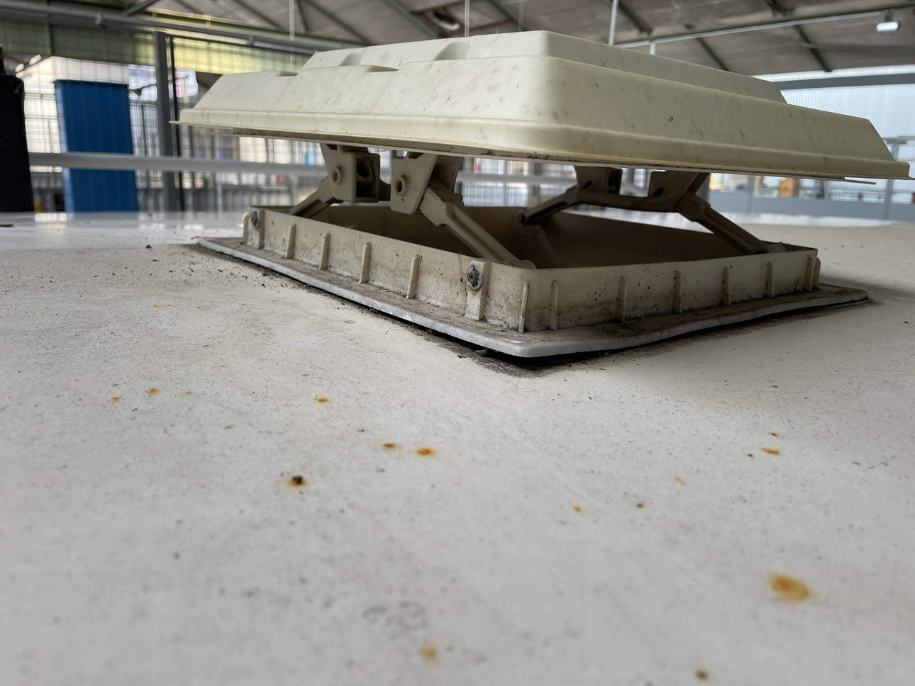 Sofortigen Handlungsbedarf wies das Dach auf! Es hatte an vielen Stellen Oberflächenrost. Und das bei einem GFK-Dach! Der Grund hierfür war wohl der folgende: Stand der Hobby in den Anfangsjahren immer in einer Halle, hatte der kürzlich verstorbene Vorbesitzer im Alter noch einen Carport für seinen Hobby bauen lassen. Der aus verzinkten Stahlprofilen bestehende Carport wurde wohl mit Blechprofilen eingedeckt, während der Hobby darunter stand. Bohrspäne und Funkenspäne waren über das Dach verteilt und hatten zum Oberflächenrost geführt. Glücklicherweise betraf dies nicht die Seitenwände und nicht die Fenster, die bis auf das der vorderen Sitzecke in einem sehr guten Zustand waren.