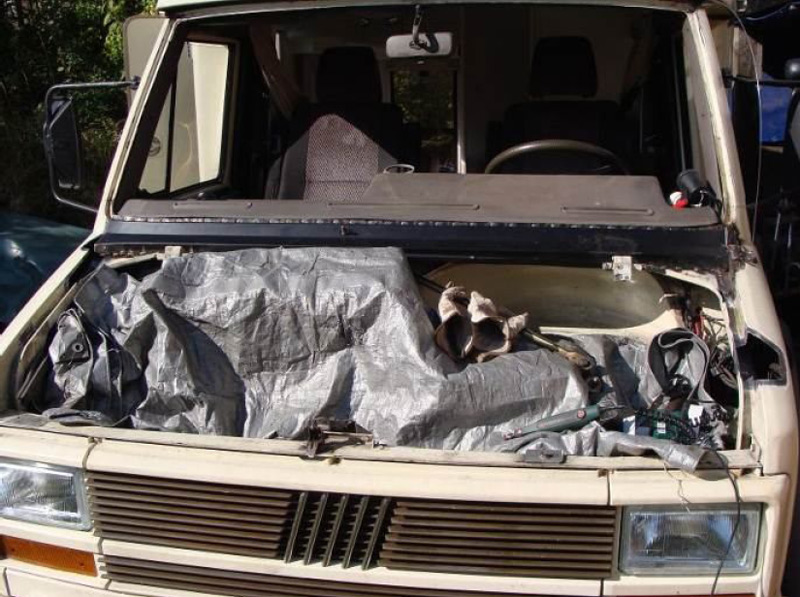 Die Frontscheibe mittels Wäscheleine wieder eingesetzt, Motorhaube eingepaßt und dann mal los zur Nachprüfung; Ergebnis: "Ohne Mängel"! Lediglich eine schwitzende Motordichtung soll im Auge behalten werden. Damit wurde das Wohnmobil für diese Saison abgemeldet und nächstes Frühjahr darf es wieder auf Reisen gehen. ;-)