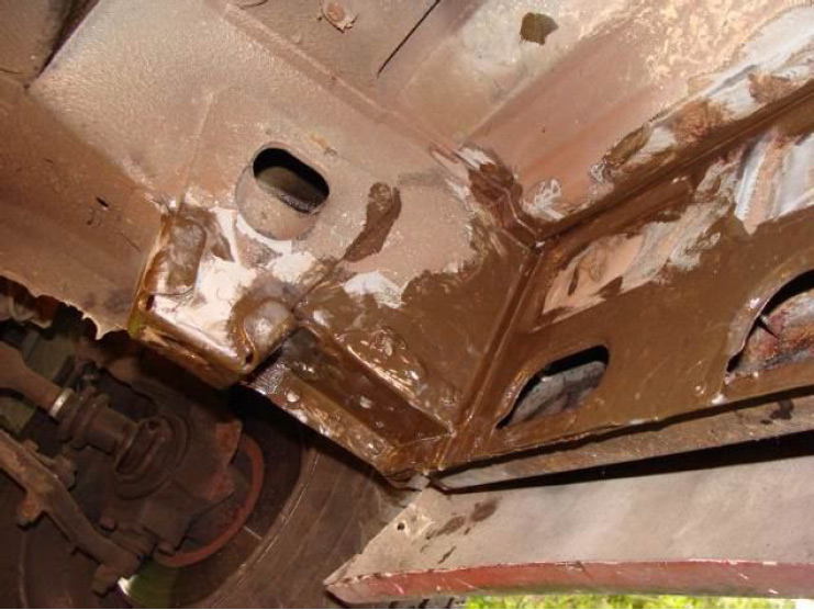 Für die Querträger fand ich keine Reparaturbleche, vielleicht war das ganz gut so, denn die Nachbildung der nun fehlenden Teile war sehr einfach. Zunächst ergänzte ich die Radhäuser, dann die beiden Querträger mit jeweils einem doppelt gewinkelten Blech. Diese Bleche bohrte ich und verschweißte durch die Bohrungen. Anschließend wurde mit Rostschutz verziert und sehr viel Hohlraumwachs eingebracht. Mit dem Prüfer war abgesprochen den Unterbodenschutz erst nach der Nachprüfung aufzubringen. Unter dem Auto liegend habe ich es geschafft mir diverse Verbrennungen zuzuziehen sowie in der Enge mir die Schleifhexe zweimal durch die linke Hand zu ziehen - insofern war ich froh nun oben weiterarbeiten zu dürfen.