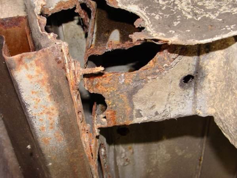 Beim Dieselfilter war lediglich die Zuleitung nachzuziehen. Dann bockte ich das Fahrzeug auf und begann an den Querträgern zu stochern. Der Rostbefall zog sich bis in die Radhäuser hinein. Daher entfernte ich zunächst die Spritzlappen. Danach wurden die ganz dünnen Trennscheiben mit der hohen Trennleistung aufgezogen und großzügig die rostbefallenen Stellen amputiert. Weiterer Vorteil ist der relativ geringe Staubanfall beim Trennen mit diesen Scheiben. Anschließend wurden mit Zopfbürste und Schruppscheibe die Farb- und Unterbodenschutzreste entfernt.