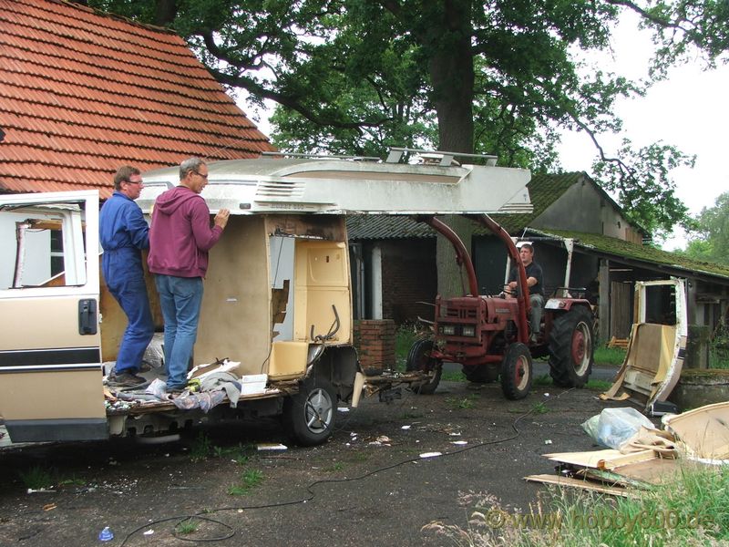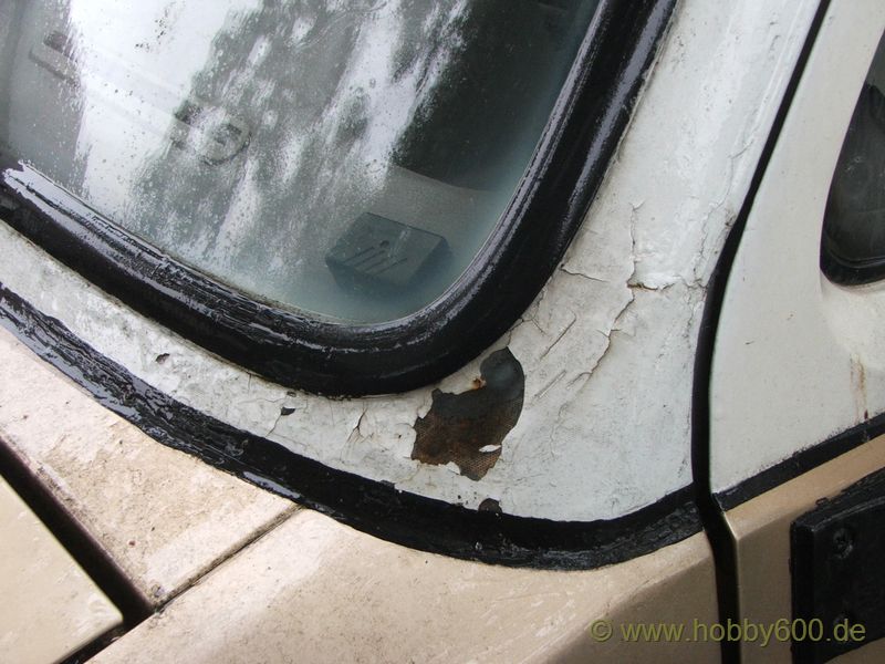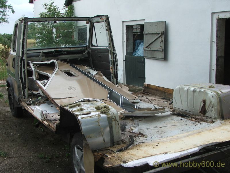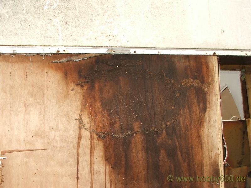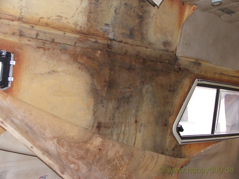 Die Besichtigung verlief dann aber nicht so erfreulich. Das Basisfahrzeug hatte die für das Alter typischen Roststellen. Praktisch musste der gesamte Vorderwagen geschweißt werden. Die Türen waren durch und auch im hinteren Radlauf ließ sich das Blech mit bloßen Fingern eindrücken. Ganz geknickt war Herr M. aber, als ich ihm mit meinem Feuchtigkeitsmessgerät zeigte, dass die rechte Seitenwand im Bereich des Kleiderschranks zu 100% Feucht war. Dieses Fahrzeug konnte ich mit ruhigem Gewissen keinem Käufer empfehlen bzw. verkaufen. So leid es mir tat, ich konnte Herrn M. nur raten, das Fahrzeug in Hameln verschrotten zu lassen. Auch als er mir anbot, mir das Fahrzeug zu schenken, war ich im ersten Moment nicht sonderlich begeistert. Zwar hätte es mich gereizt, mal eine Autopsie an einem Hobby 600 durchzuführen, aber ich wollte demnächst wegfahren und dazu kam, das ich bei uns zu Hause keinen Platz zum Abstellen mehr habe.