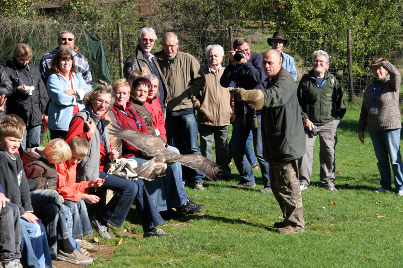 Für den Vormittag hatte Alfred (Wille Wäller) einen Besuch in der Falknerei des Wildparks organisiert. Falkner Kai präsentierte uns seine Vögel und gab interessante Erläuterungen zur Jagd mit Falken. Speziell die Flugshow war beeindruckend. Trotz großer Zuschauergruppe gehorchte der Bussard „Mäbu" seinem Herrn aufs Wort und zeigte, was er gelernt hatte. ..manchmal knapp über den Köpfen der Zuschauer. Abschließend zeigte uns Kai noch einige seiner Frettchen. Insgesamt eine gelungene Vorführung.