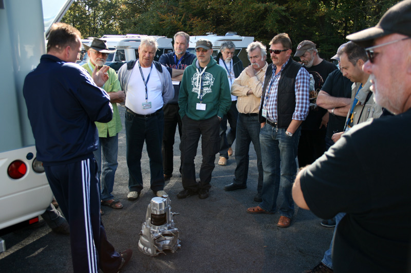 Zurück am Platz war Mario eingetroffen. Als alter Ducato-Schrauber und Werkstattbesitzer stand er den meist männlichen Teilnehmern für Fragen zur Verfügung. An einem aufgeschnittenen Getriebe erläuterte er die Funktion und die bekannte Problematik des 5.Gangs. Aber auch Luftfederung oder Turbolader wurden diskutiert. Bei den anwesenden Fahrzeugen waren auch jeweils zwei Fahrzeuge der 230er- (von 1995-2001) und 244er- (von 2001-2006) Generation dabei.