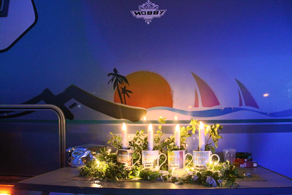 Am Dienstag reisten weitere Helfer an, sodass am Mittwoch die erforderlichen Absperrungen und Dekorationen aufgestellt werden konnten. Diese waren noch nicht ganz fertig, da rollten auch schon die ersten Hobby 600 an. Dann ging es Schlag auf Schlag. Bis spät in den Abend kam ein Großteil der Teilnehmer auf den Platz. Da sich die meisten von ihnen bereits von früheren Treffen kannten, fiel die Begrüßung entsprechend herzlich aus. Brigitte (Schattenparker) nahm zunächst die Brötchenbestellungen auf und so stand einem Frühstück im Freien unter strahlender Sonne am Donnerstagmorgen nichts im Weg.