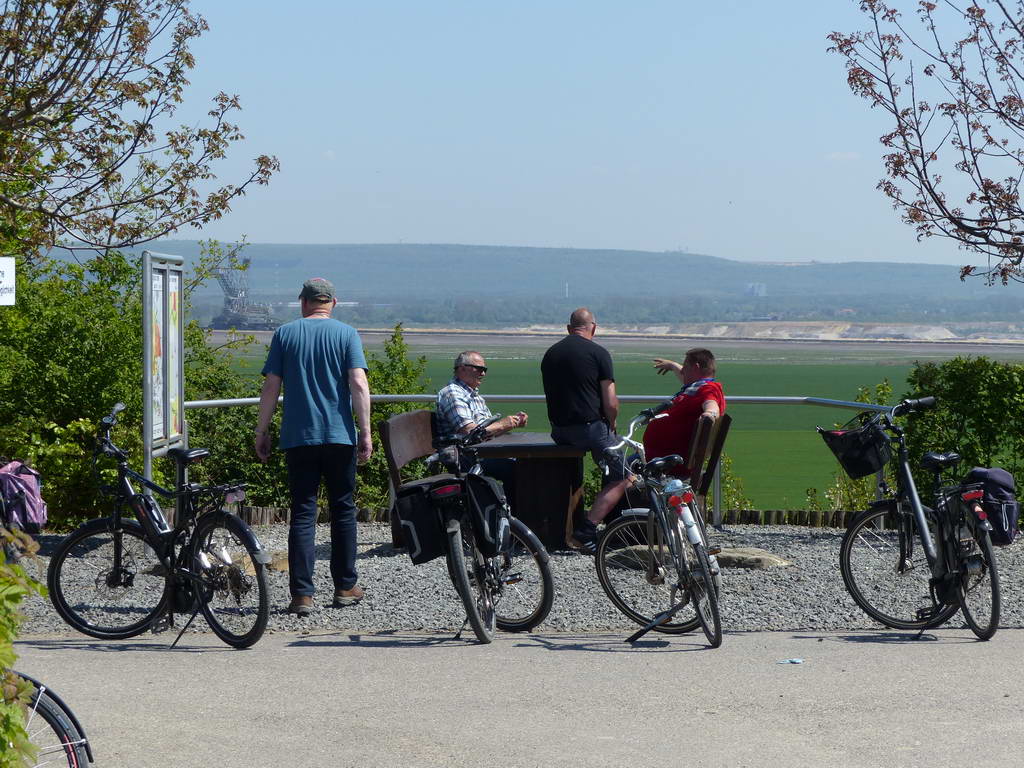 Die Strecke führte einmal rund um den Braunkohle-Tagebau Inden. Eine Wegbeschreibung findet Ihr hier. Weitgehend abseits von Straßen führte die Tour durch rekultivierte Flächen. Natur pur und immer wieder tolle Einblicke in die Technik eines Tagebaus. Leider forderten die Schotterpisten auch ihre Opfer. Ein Hinterrad mochte sie überhaupt nicht und ließ gleich dreimal die Luft ab. Möglicherweise lag die Häufung an Platten aber auch an dem beim ersten Mal verwendeten Pannenspray. Es verhinderte wohl eine dauerhafte Verbindung der Flicken mit dem Fahrradschlauch. Auf jeden Fall hatte Harry (koldt) reichlich zu tun. Höhepunkt der Fahrradtour war im wahrsten Sinne des Wortes der Indemann, ein 36 m hoher Aussichtsturm auf einer alten Halde. Von hier hatte man eine herrliche Weitsicht über Jülich und Umgebung.