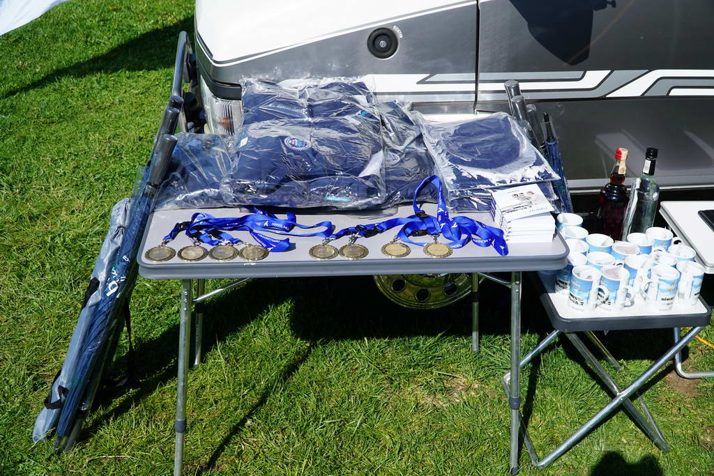 Am Dienstag reisten weitere Helfer an, sodass am Mittwoch die erforderlichen Absperrungen und Dekorationen aufgestellt werden konnten. Diese waren noch nicht ganz fertig, da rollten auch schon die ersten Hobby 600 an. Dann ging es Schlag auf Schlag. Bis spät in den Abend kam ein Großteil der Teilnehmer auf den Platz. Da sich die meisten von ihnen bereits von früheren Treffen kannten, fiel die Begrüßung entsprechend herzlich aus. Brigitte (Schattenparker) nahm zunächst die Brötchenbestellungen auf und so stand einem Frühstück im Freien unter strahlender Sonne am Donnerstagmorgen nichts im Weg.
