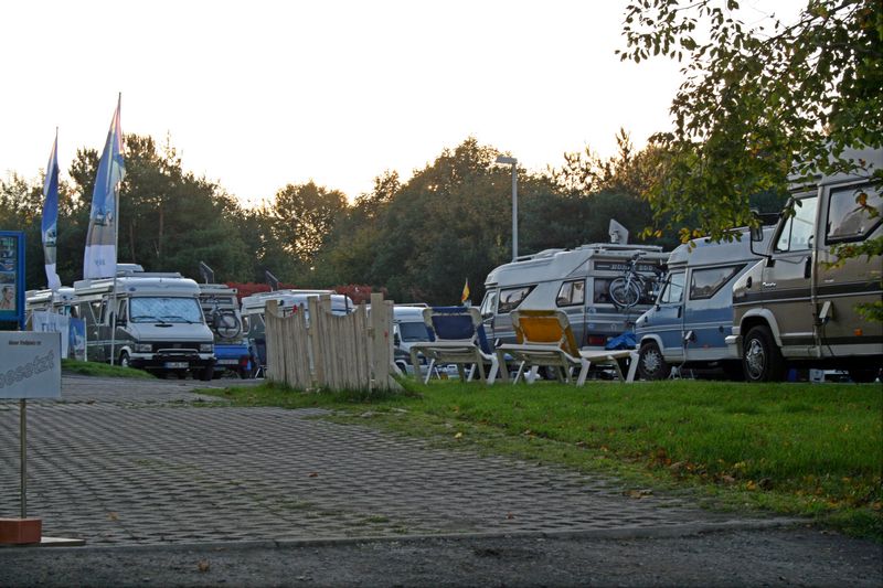 Ich suchte einen Schattenplatz (für meinen Hund) und quetschte mich zwischen die Fahrzeuge von Luc und Jojo. Dort fiel von den Bäumen ein langer Schattenstreifen auf den Platz. Luc meinte, da sei überall so viel Platz, warum hier so eng? Stimmt ja, aber wenn man einen Hund an Bord hat, denkt man nur an sein Wohlergehen. Sorry von hier aus noch mal, lieber Luc! Und danke für den Hinweis, bei der Stromsäule die Nr. 6 zu wählen. Du hattest ja schon Geldmünzen auf Vorrat für Dich reingesteckt!