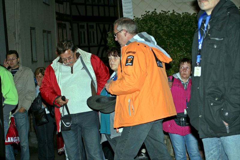 Der Abschluß der Führung endete im Obertorturm, wo uns im Innern eine Wendeltreppe mit Kerzen auf den Stufen empfing. War das schön! Der Mann der Stadtführerin schenkte uns einen Hexentrunk oder alkoholfreien Hollersaft ein. Da wir zu 60 Personen nicht alle in den kleinen Wachraum paßten, um unser Abschlußlikörchen zu trinken, gingen noch einige den Turm weiter rauf oder kamen später, es wurde eng aber es klappte. Ich hatte den anderen noch gesagt, daß wir der Stadtführerin zum Schluß ein kleines Trinkgeld zukommen lassen wollen. Und so war ich froh, daß Lutz (rallyefreak) den ledernen Cowboyhut von Günter (speedy75) schon mal als Kollekte-Behältnis aktiviert und mit dem Sammeln angefangen hatte. Ich übernahm dann den Hut und Lutz holte sich seinen Hexentrunk aus dem Wachstübchen.